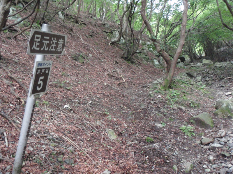 井戸谷通報ポイントC 移動距離 850m 所要時間 40分 GPS高度 569m 緯度 34;58:26.5 経度 136;26:27.0 ここより滑落注意 |