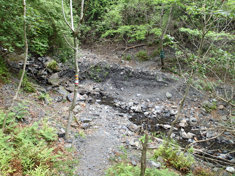 沢を渡る 移動距離 所要時間 GPS高度 緯度 経度 井戸谷通報ポイント@からすぐ 沢を渡り左へ登山道登り 右は行き止まり |