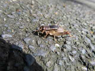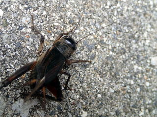 短く茶色い翅を持った、飛ぶことのできない、青いバッタ |