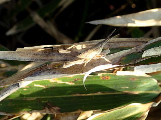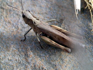後脛節と翅の先端の黒色が目立つ、 やや大きめのバッタ。オスは明るい黄褐色で、メスは枯草色 |