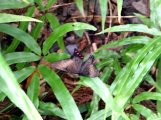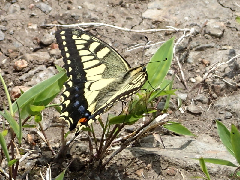 ナミアゲハ 和名:ナミアゲハ(並揚羽) 学名:Papilio xuthus 分類:アゲハチョウ科>アゲハチョウ亜科 撮影:2014/06/16 山頂にて 成虫の前翅長は4 - 6cm 正面写真 |