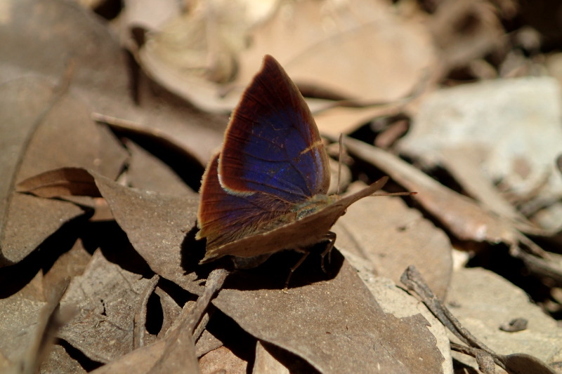 ムラサキシジミ♂ 和名:ムラサキシジミ(紫小灰蝶) 学名:Narathura japonica japonica 分類:シジミチョウ科 撮影:2015/10/20 二本松にて 開張約30-40mm 雄は先端がとがっている |