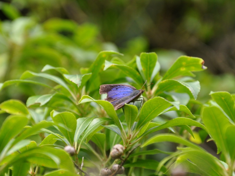 ムラサキシジミ♀ 和名:ムラサキシジミ(紫小灰蝶) 学名:Narathura japonica japonica 分類:シジミチョウ科 撮影:2015/07/20 山頂にて 開張約30-40mm 翅の表が青紫色で、周囲を黒褐色で縁取られている。成虫で越冬し 花を訪れる事は少なく、成虫が主に何を摂取しているのか不明 |