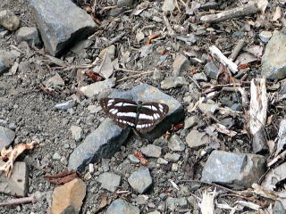 コミスジ 和名:コミスジ 学名:Neptis sappho intermedia 分類:タテハチョウ科>イチモンジチョウ亜科 撮影:2015/05/31 滝ヶ谷にて 開張 23-31mm 濃茶色地に三本の白い帯を持つやや小さめのタテハチョウ |