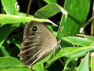 ヒカゲチョウ 和名:ヒカゲチョウ(日陰蝶)ナミヒカゲ 学名:Lethe sicelis 分類:タテハチョウ科>ジャノメチョウ亜科 大きさ (前翅長)25-34mm 雑木林の縁の草藪や林内で見られる薄茶色の地味なチョウ。 はねの形はスマートで、裏面に目玉模様を持つ |