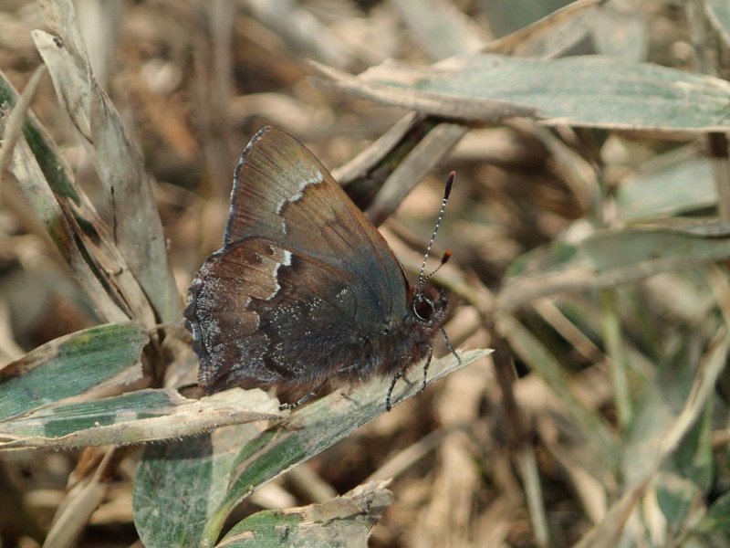 コツバメ 和名:子ツバメ(小燕) 学名:Callophrys ferrea 分類:シジミチョウ科>シジミチョウ亜科 撮影:2016/04/09 山頂にて 大きさ (前翅長)11-16mm 小さな茶色いシジミチョウ。胴体は毛深い。 |