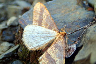 ビロードナミシャク 和名:ビロードナミシャク 学名:Sibatania mactata 分類:シャクガ科>ナミシャク亜科 撮影:2016/05/23 二本松にて ♂:34~38mm ♀:40~45mm ビロードのような地色が和名の由来となっており、 淡褐色の横線模様が引き立ち非常に美しい。 |