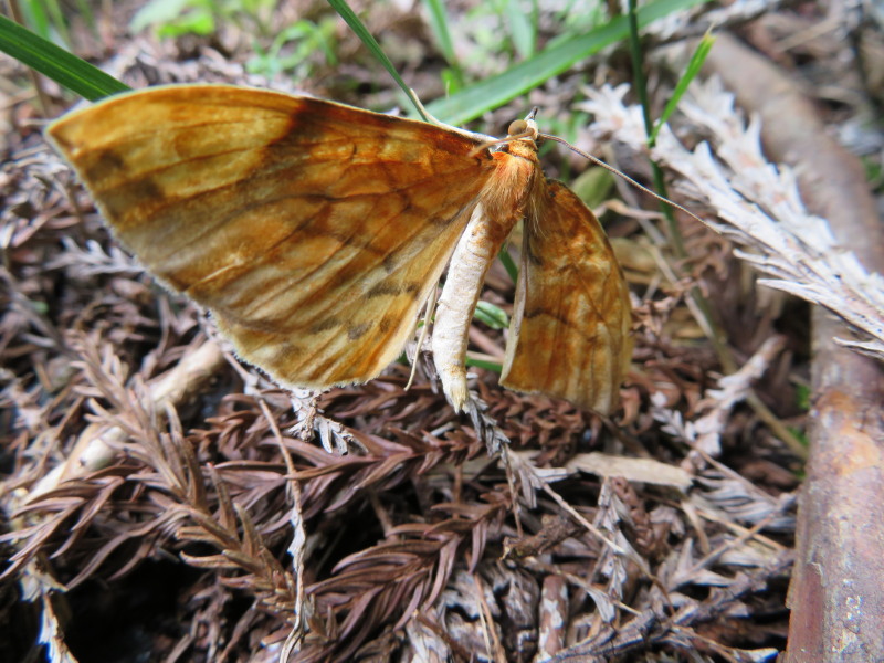 イカリモンガ 和名:イカリモンガ(碇紋蛾) 学名:Pterodecta felderi 分類:チョウ目 >イカリモンガ科 撮影:2016年7月24日 井戸谷にて 茶色でやや角張った形の翅を持つガ。前翅にはオレンジの紋がある はねをたたんでとまるなど ガの仲間でありながら、チョウの仲間の特徴をもつ 翅前翅にある大きなオレンジ色の碇 形状の紋が、和名の由来である |